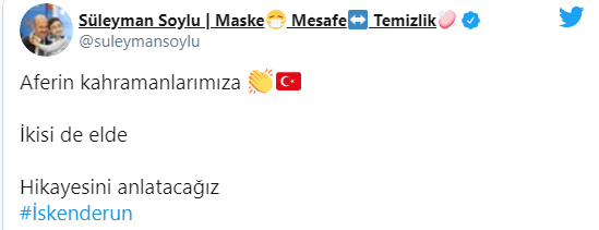 Bakan Soylu, yürütülen operasyon sonucunda, İskenderun'da 2 teröristin de etkisiz hale getirildiğini duyurdu. Soylu paylaşımında, "Aferin kahramanlarımıza. İkisi de elde. Hikayesini anlatacağız" ifadelerini kullandı.