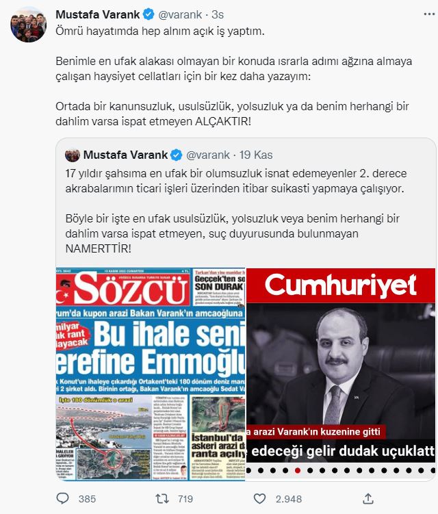 Sözcü ve Cumhuriyet Gazetesi'nde konuyla ilgili asılsız haberlere ilişkin sosyal medya hesabından açıklama yapan Bakan Varank, "Ömrü hayatımda hep alnım açık iş yaptım. Benimle en ufak alakası olmayan bir konuda ısrarla adımı ağzına almaya çalışan haysiyet cellatları için bir kez daha yazayım: 17 yıldır şahsıma en ufak bir olumsuzluk isnat edemeyenler 2. derece akrabalarımın ticari işleri üzerinden itibar suikasti yapmaya çalışıyor. Ortada bir kanunsuzluk, usulsüzlük, yolsuzluk ya da benim herhangi bir dahlim varsa ispat etmeyen ALÇAKTIR!" ifadelerine yer verdi.