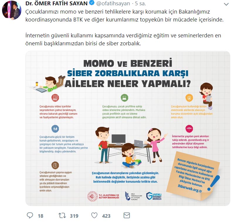 Sayan, Twitter hesabından yaptığı paylaşımda, çocukları "Momo" ve benzeri tehlikelere karşı korumak için Bakanlık koordinasyonunda BTK ve diğer kurumların mücadele içinde olduğunu belirtti.