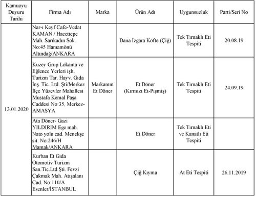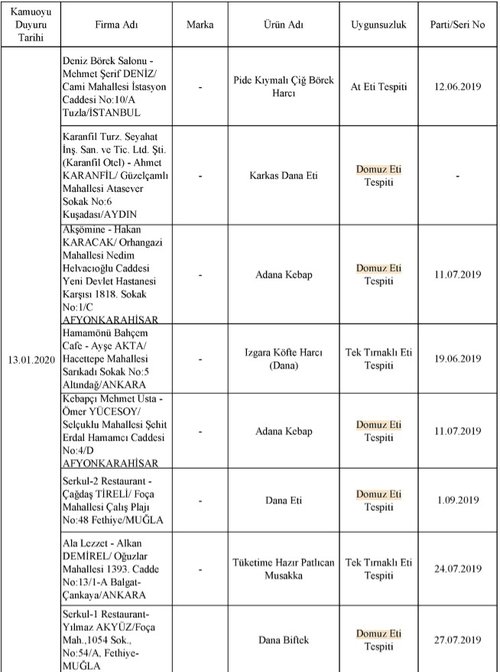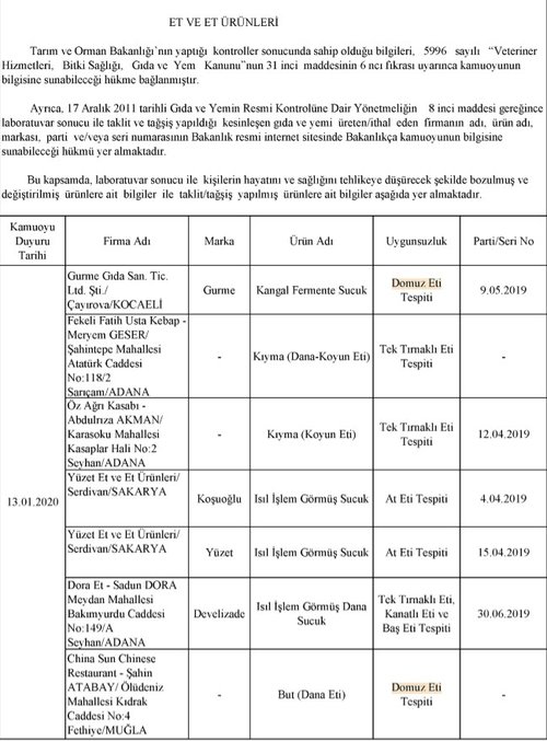 Bakanlığın yaptığı incelemelerde 229 firmaya ait toplam 386 parti üründe hile tespit edildi. Daha önce yayınlanan listelerde yer alan ve vatandaşa domuz eti yedirdiği tespit edilen Gurme Gıda yine aynı skandalla listeye girdi.