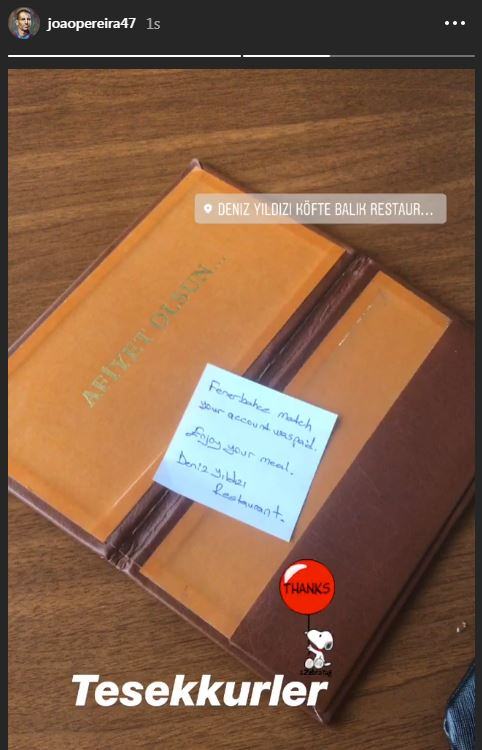 Bordo – Mavili takımın başarılı sağ bek oyuncusu Pereira, Trabzon’da gittiği restoranda flaş bir adisyonla karşılaştı. Hesabı isteyen sağ bek oyuncusu Pereira'ya "Sen hesabı Fenerbahçe maçında ödedin" yazılı bir adisyon geldi. Portekizli futbolcu Pereira bu jest karşısında büyük şaşkınlık yaşarken sosyal medya hesabından bir paylaşım yaptı ve teşekkür etti.