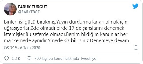Dizinin yapımcısı Faruk Turgut ise “Birileri işi gücü bırakmış, yayın durdurma kararı almak için uğraşıyorlar. 2’de olmadı bir de 17’de şanslarını denemek istemişler. Bu seferde olmadı. Benim bildiğim kanunlar her mahkemede aynıdır. Yine de siz bilirsiniz. Denemeye devam” diye konuştu.