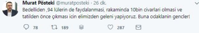 Kişisel sosyal medya hesabından paylaşımda bulunan Pösteki, "Bedelliden ,94 lülerin de faydalanmasi, rakaminda 10bin civarlari olmasi ve tatilden önce çıkması icin elimizden geleni yapiyoruz. Buna odaklanin gencler!" ifadelerini kullandı.