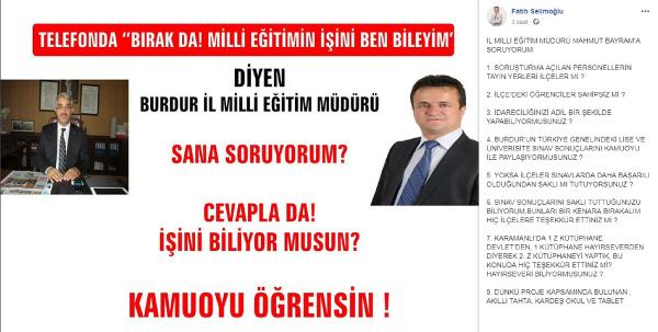 İlçedeki öğrencilerin sahipsiz bırakıldığını ve başarılarının göz ardı edildiğini savunan Başkan Selimoğlu, kendisi ve Mahmut Bayram'ın fotoğrafıyla birlikte "Telefonda, 'Bırak da milli eğitimin işini ben bileyim' diyen Burdur İl Milli Eğitim Müdürü sana soruyorum? Cevapla da işini biliyor musun, kamuoyu öğrensin" mesajını paylaştı.