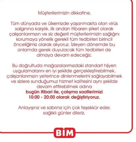 Daha önce çalışma saatlerini 09.00-21.00 olarak açıklayan BİM ve 101 marketleri yeni düzenlemeye gitti.