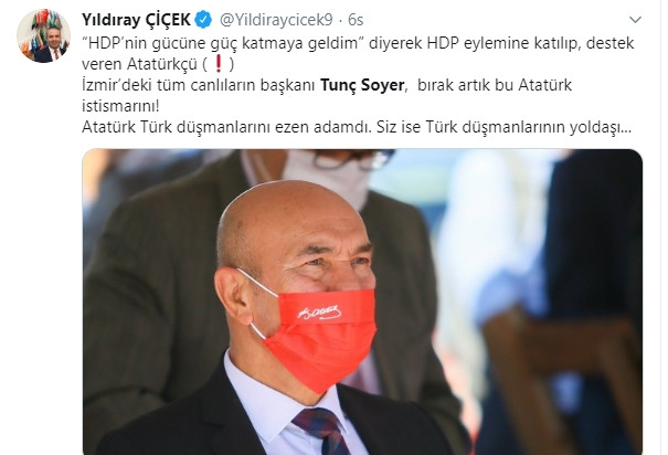 “Gazi Mustafa Kemal Atatürk, Tunç Soyer gibi kişiler için ancak bir maskedir. Onun büyük isminin arkasına, kendi kirli sicillerini gizlemeye çalışırlar. Cumhuriyetimizin kurucusu Gazi Paşamızın fikirlerini yok sayan, kirli yüzlerini gizlemek için Atatürk'ümüzü "maske" olarak kullanan, asli görevi olan belediyecilik hizmetleri beklerken PR çalışmalarıyla İzmir'imizin geleceğinden çalan Tunç Soyer ve zihniyeti kaybetmeye mahkumdur.” dedi.
