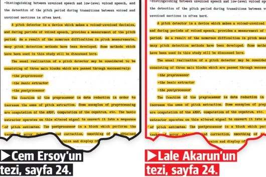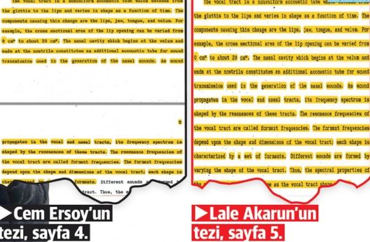 2 yıllık eğitim sürecinde birbirine yardımcı olan Ersoy ile Akarun, tez aşamasına geçince işi daha ileriye taşıdı. İki isim tezlerinin 14 sayfasını blok alarak birebir kopyaladı. Her iki tezde de noktasına virgülüne bile dokunulmadan aynı grafiklere yer verildi. Ayrıca tezlerde blok olarak yapılan alıntılar atıfta bulunmadan kullanıldı. Hiç atıf olmayan kaynaklara da tezde yer verildi.