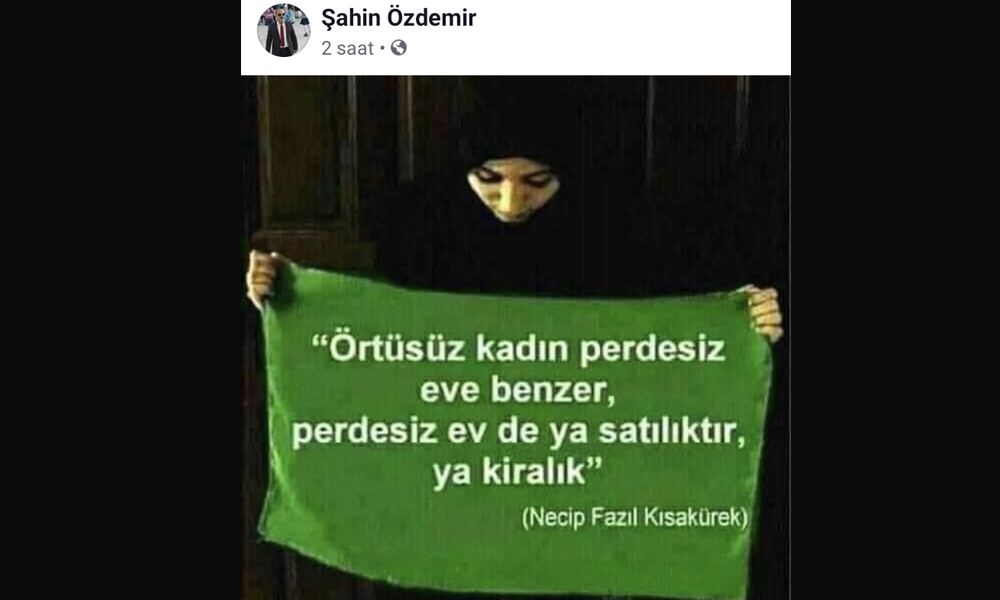 Paylaşımda, “Örtüsüz kadın perdesiz eve benzer. Perdesiz ev ya satılıktır ya da kiralık” ifadeleri yer aldı.