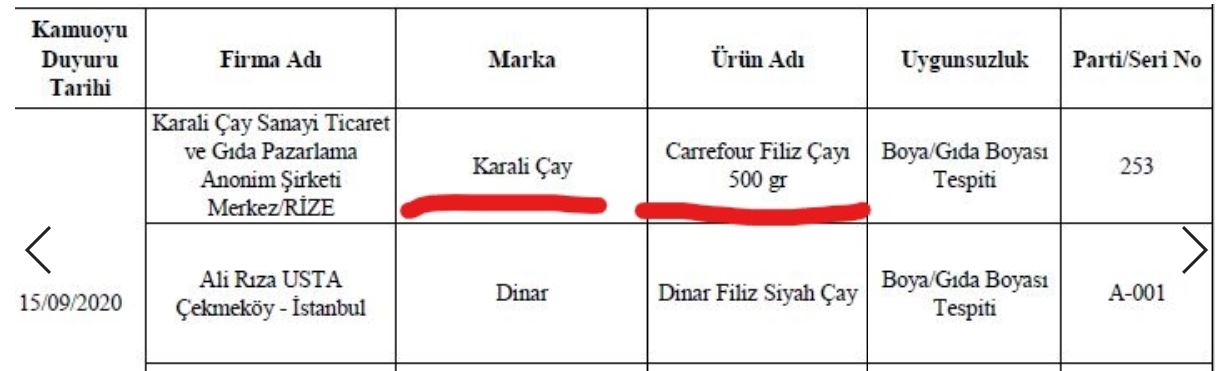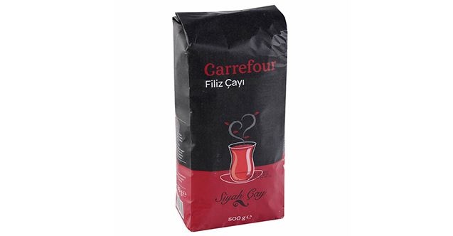 Tarım ve Orman Bakanlığı'nın açıkladığı listede adı bulunan Carrefour zincir marketlerinde Carrefour markası ile satılan Karali Filiz çayında boya kullanıldığı tespit edildi.