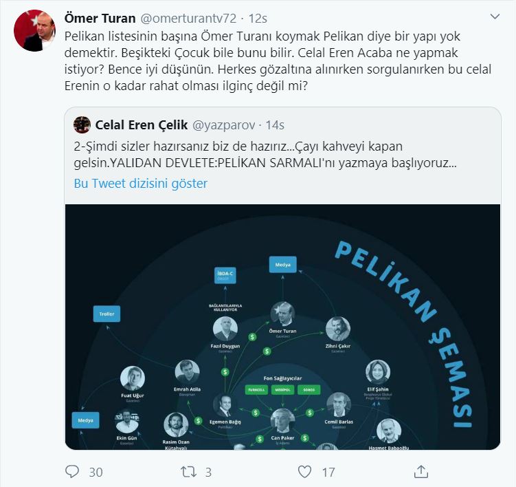 Siyaset Bilimci, Ömer Turan'da sosyal medya hesabından bu yazıyı yazan Çelik'i hedef gösterdi ve 'Pelikan listesinin başına Ömer Turanı koymak Pelikan diye bir yapı yok demektir. Beşikteki Çocuk bile bunu bilir. Celal Eren Acaba ne yapmak istiyor? Bence iyi düşünün. Herkes gözaltına alınırken sorgulanırken bu celal Erenin o kadar rahat olması ilginç değil mi?' diyerek Çelik'in tutuklanması gerektiğin savundu.