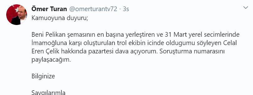 Turan, 'Beni Pelikan şemasının en başına yerleştiren ve 31 Mart yerel secimlerinde İmamoğluna karşı oluşturulan trol ekibin icinde oldugumu söyleyen Celal Eren Çelik hakkında pazartesi dava açıyorum. Soruşturma numarasını paylaşacağım.' dedi.