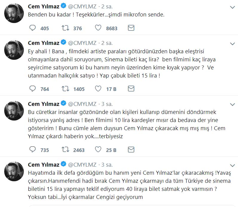 'Hayatımda ilk defa gördüğüm bu hanım yeni Cem Yılmaz’lar çıkaracakmış! Yavaş çıkarsın. Hanımefendi hadi bırak Cem Yılmaz çıkarmayı da tüm Türkiye de sinema biletini 15 lira yapmayı teklif ediyorum 40 liraya bilet satmak yok var mısın? Yoksun tabii… İyi çıkarmalar, Cengizi geçiyorum.