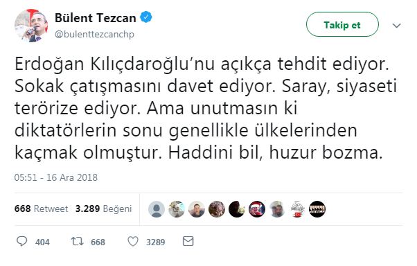 Twitter’dan paylaşımlarda bulunan Tezcan, Recep Tayyip Erdoğan’ın Kemal Kılıçdaroğlu’nu tehdit ettiğini, sokak çatışmalarına davet ettiğini ifade ederek şu ifadeleri kullandı: