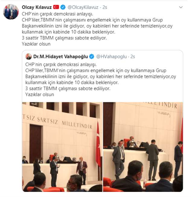 ''An itibarıyla @TBMMresmi Genel Kurulunda Sayıştay için üye seçimi esnasında CHP’li milletvekiller Meclisi çalıştırmamak için oy kabinlerine girip cep telefonu ile konuşma yapıyor, adeta saklambaç oynuyor. Twitter’da uzun video paylaşılamadığı için hepsini paylaşamıyoruz. Üzücü..'"