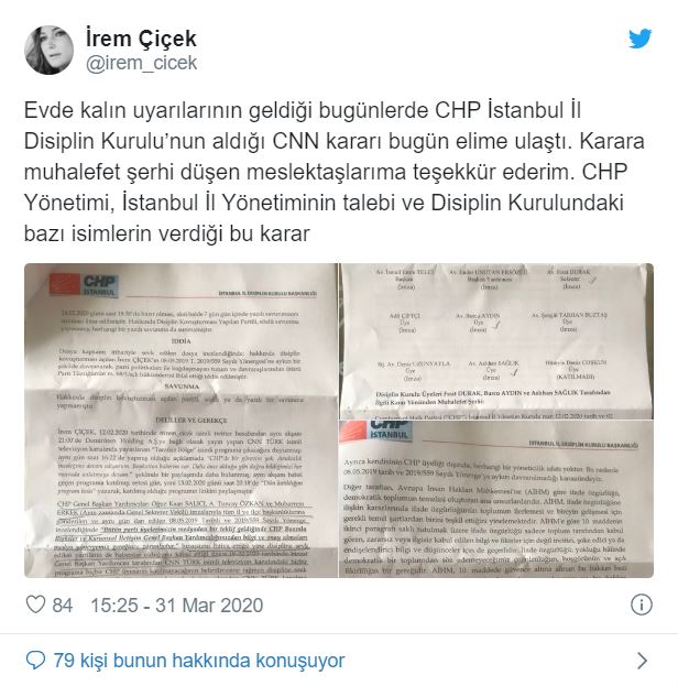 Çiçek, “Evde kalın uyarılarının geldiği bugünlerde CHP İstanbul İl Disiplin Kurulu’nun aldığı CNN kararı bugün elime ulaştı. Karara muhalefet şerhi düşen meslektaşlarıma teşekkür ederim. CHP Yönetimi, İstanbul İl Yönetiminin talebi ve Disiplin Kurulundaki bazı isimlerin verdiği bu karar” mesajıyla İl Disiplin Kurulu’nun ihraç kararını paylaştı.