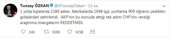 "1 yılda kışlalarda 2180 asker, fabrikalarda 1048 işçi, yurtlarda 909 öğrenci yedikleri gıdalardan zehirlendi. AKP'nin bu konuda attığı tek adım CHP'nin verdiği araştırma önergelerini REDDETMEK."
