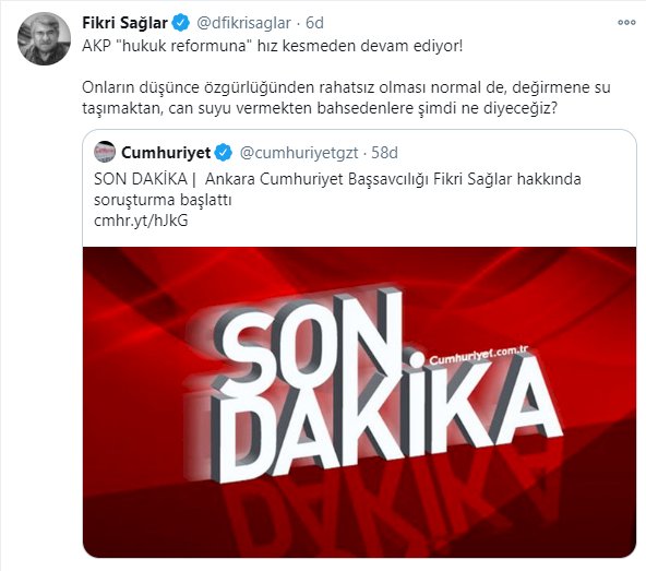 Ankara Cumhuriyet Başsavcılığından yapılan yazılı açıklamada, “Ankara Cumhuriyet Başsavcılığımızca; 30.12.2020 tarihinde katıldığı bir televizyon programında, ‘Türbanlı hakim karşısına gittiğimde adaleti savunacağı konusunda kuşkum var. Bazıları militanca ve ideolojik takılıyor, bununla mücadele edilmeli' şeklindeki sözleri nedeniyle Durmuş Fikri Sağlar hakkında, 5237 sayılı Türk Ceza Kanununun 216. maddesi kapsamında halkı kin ve düşmanlığa tahrik veya aşağılama suçundan, re'sen soruşturma başlatılmıştır” denildi.
