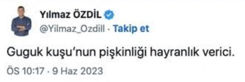 Sosyal medya hesabından yaptığı paylaşımda Kılıçdaroğlu'na 'Guguk Kuşu' diyen Özdil, "Guguk kuşunun pişkinliği hayranlık verici." dedi.
