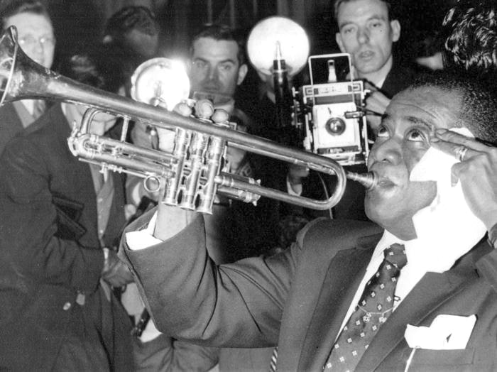 Louis Armstrong, gazetecilerle yaptığı bir toplantı anında
