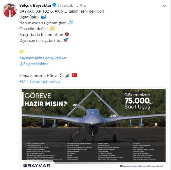 Erdoğan’ın damadı Bayraktar, İHA pilotu, Yapay Zeka Yazılım Uzmanı ve Yazılım Mühendisi başta olmak üzere birçok alanda eleman alımı yapacaklarını sosyal medya hesabından yaptığı paylaşımda duyurdu.