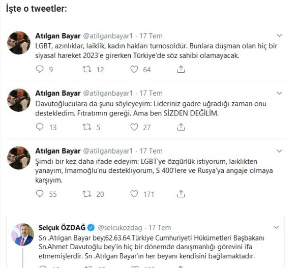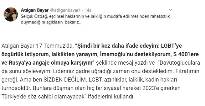 2023'de yapılacak seçimde, 'eşçinselleri yok sayanların iktidar olma şansı yok' diyen Atılgan Bayar'ı başdanışman yapan, Gezi'nin düzenleyicileri içinde olan ve İslam düşmanlarını 'Yeni Nesil Politikalar' adı altında Demokrat Parti'ye dolduran Gültekin Uysal, Ak Parti çinden ayrılan ve Deva partisini kuran Babacan, Gelecek Partisini kuran Davutoğlu, İP'in Genel Başkanı Meral Akşener, PKK'nın siyasi ayağı HDP ve CHP'nin kasetle Genel Başkanı olan Kılıçdaroğlu ile iktidarı devirmek, şahsınızı 'Başkanlık' makamından indirerek, Türkiye'yi yeniden Parlamenter sisteme dönüştürmenin seferliğine soyunmuşlardır...
