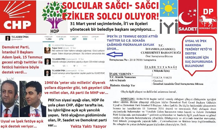 Taksim'de ağaçları bahane ederek, Gezi Kalkışmasını destekleyen, 15 Temmuz'da şahsınızın çağrısı ile 'sokağa çıkan ve fetö alçağının emrindeki alçakların sıktığı kurşunlara rağmen canlarını ortaya koyan şehitlerimiz ile gazilerimiz için, 'Gezide sokağa çıkanlara ' çapulcu' diyen, C.B milleti sokağa çağırıyor, güzel senaryo, ama figüranlar çaylak yazık bu ülkeye' diye attığı Attığı tweet sonrası, Demokrat Parti GİK Üyeliği ile ödüllendirilen Adem İpek ve DP Genel Başkanı Gültekin Uysal'ın ' bizim iktidarımızda fetullah hocamızın vatan hasreti ve özlemi bitecek' açıklamalarından dolayı, İstanbul Cumhuriyet Savcılığı'na ' Terör Örgütü Propagandası' yaptıklarından dolayı suç duyurusunda bulundum...