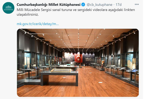 Cumhurbaşkanlığı Millet Kütüphanesi sosyal medya üzerinden yaptığı paylaşımla Milli Mücadele Sergisi’nin sanal turlara açıldığını ve ayrıca sergideki diğer videoların da paylaşıma açıldığı müjdesini verdi. Ayrıca "Cumhuriyetin 97. Yılında Milli Mücadele Sergisi Hakimiyet Milletindir" sergisinde sergilenen tarihi objelerin de yer aldığı serginin kataloğu da paylaşıma açıldı..