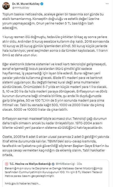 Ekonomist Murat Kubilay sosyal medya hesabından yaptığı paylaşımında tartışmalara neden hatıra paranın neden 5 TL olarak basıldığını açıkladı.