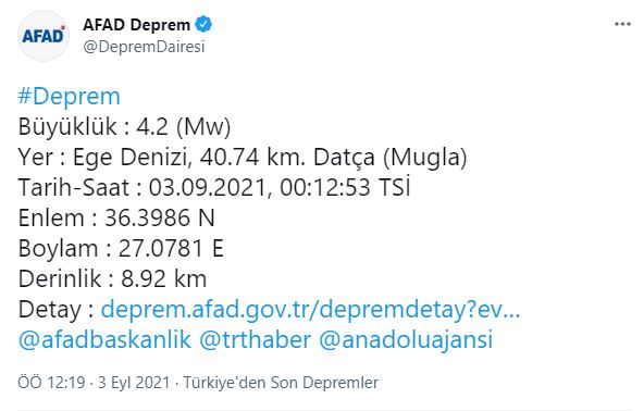 Afet ve Acil Durum Yönetimi Başkanlığının (AFAD) internet sitesinde yer alan bilgiye göre, Ege Denizi'nde saat 00.12'de 4,2 büyüklüğünde deprem kaydedildi.