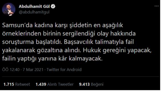 Bakan Gül, sosyal medya hesabından yaptığı paylaşımda, "Samsun’da kadına karşı şiddetin en aşağılık örneklerinden birinin sergilendiği olay hakkında soruşturma başlatıldı. Başsavcılık talimatıyla fail yakalanarak gözaltına alındı. Hukuk gereğini yapacak, failin yaptığı yanına kâr kalmayacak" diye yazdı.