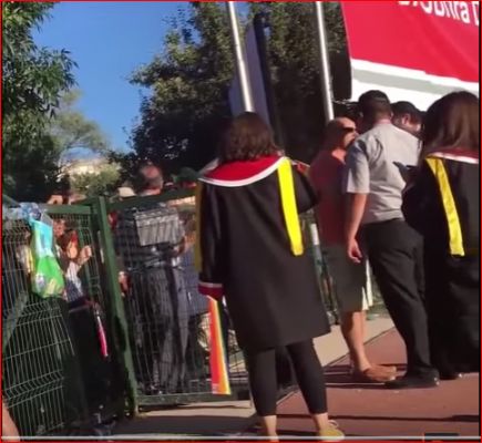 Bu sırada iddiaya göre mezuniyet alanına girmek isteyen öğrenci yakını güvenlik görevlileriyle tartıştı. Güvenlikçilerden biri hiç beklemediği anda öğrenci yakınına kafa attı. O anlar amatör kamera tarafından saniye saniye görüntülendi.