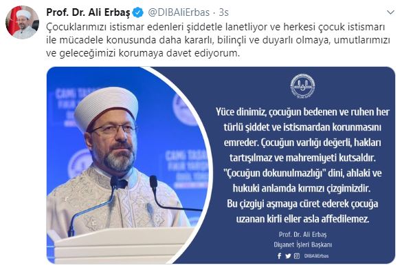 Diyanet işleri Başkanı Prof. Dr. Ali Erbaş resmi Twitter hesabından çocuk istismarı ile ilgili bir tweet attı.