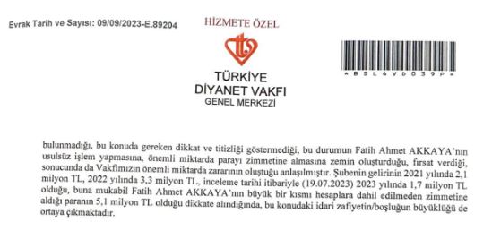 Sözcü, bu konudaki Teftiş Kurulu raporuna ulaştı. Diyanet personeli Fatih Ahmet Akkaya’nın, şubenin bir yıllık gelirinden daha fazlasını zimmetine geçirmesi ve yetkililerin bunu fark etmemesi dikkat çekti.