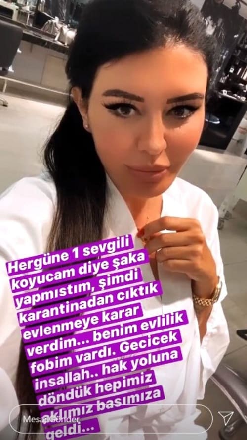 Her anını takipçileriyle paylaşan Ebru Polat, bugün saçlarını boyatmak için gittiği kuaförde evlilik müjdesini verdi. Video çekerek özel hayatı hakkında konuşan şarkıcı, "Her güne 1 sevgili koyacağım diye şaka yapmıştım şimdi karantinada çıktık evlenmeye karar verdim. Benim evlilik fobim vardı. Geçecek inşallah. Hak yoluna döndük hepimiz aklımız başımıza geldi. Doğru olanın evlilik olduğuna karar verdim. Ben hayranımla evleneceğim demiştim. Eşimi size yakında göstereceğim. Evet evleneceğim az kaldı" dedi.