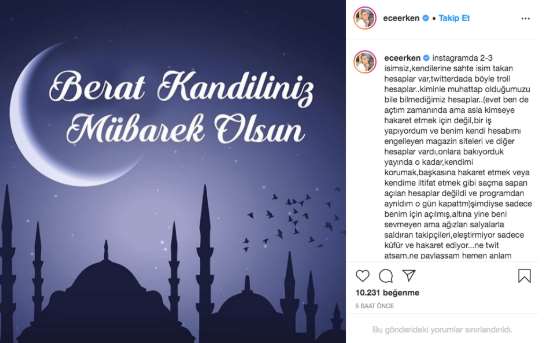 ''Beni, sizi bir tek Allah yargılar. Allah'a hesap veririm. Bugün kandil lütfen artık sadece bana ve aileme hakaret edilen troll hesaplara en azından bakarak ortak olmayın. Allah hepimizin günahlarını affetsin. Dünya olarak zor günler geçiriyoruz, Allah yardımcımız olsun.''