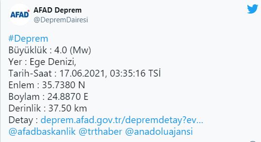 Afet ve Acil Durum Yönetimi Başkanlığının (AFAD) internet sitesinde yer alan bilgiye göre, saat 03:35’te Ege Denizi'nde 4 büyüklüğünde deprem kaydedildi.