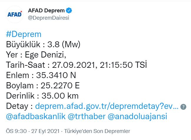 AFAD'ın açıkladığı bilgilere göre, saat 21.15 sularında Ege Denizi'nde 3.8 büyüklüğünde bir deprem meydana geldi. Depremin 35 km derinlikte gerçekleştiği bildirildi.