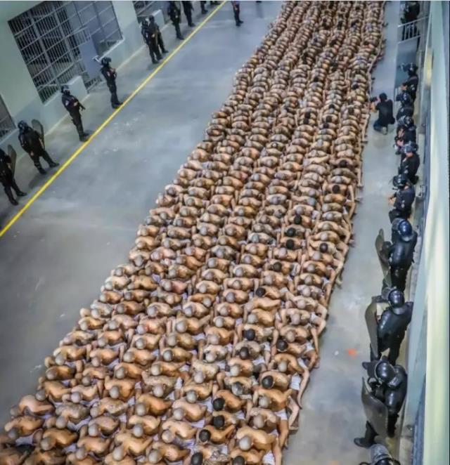 Yüksek teknolojili hapishaneye ilk olarak 2 bin çete mensubu getirildi. AFP Haber ajansının servis ettiği fotoğraflarda çete mensuplarının üzerlerinde sadece beyaz şortlarla, yalın ayak hapishaneye girdiği görülüyor. Elleri arkadan kelepçeli olan mahkumların hepsinin mensup oldukları çetelere dair dövmeler taşıması ve hepsinin saçlarının kazınmış olması dikkat çekiyor.