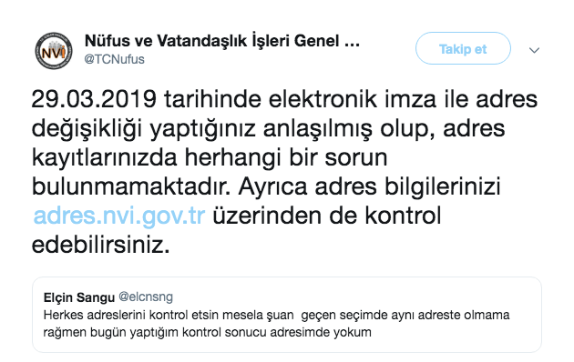 Oyuncu Sangu'nun bu paylaşımına Nüfus ve Vatandaşlık İşleri Genel Müdürlüğü’nden "29.03.2019 tarihinde elektronik imza ile adres değişikliği yaptığınız anlaşılmış olup, adres kayıtlarınızda herhangi bir sorun bulunmamaktadır. Ayrıca adres bilgilerinizi https://adres.nvi.gov.tr üzerinden de kontrol edebilirsiniz." yanıtı geldi.