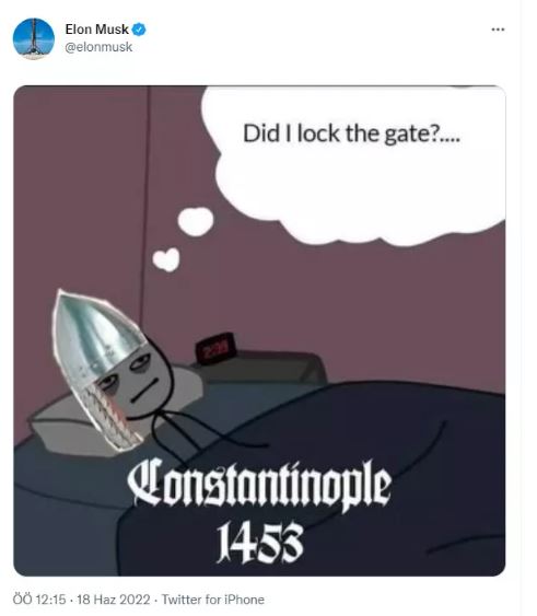 Tesla ve SpaceX CEO'su Elon Musk’ın Twitter hesabında yaptığı paylaşım sosyal medyada gündem oldu. Hesabından 1453 İstanbul’un Fethi’ne gönderme yapan bir görsel paylaşan Musk, “Did I lock the gate? (Kapıyı kilitledim mi?) yazdı.