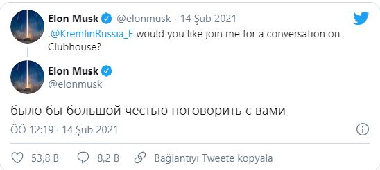 "Clubhouse'ta sohbet için bana katılmak ister misiniz?” paylaşımında bulunan Musk, ardından Rusça devam ederek, "Sizinle sohbet etmek benim için büyük bir onur olur” diye yazdı.