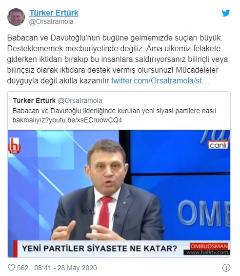 Sosyal medya hesabında da açıklamalar yapan Ertürk, “Babacan ve Davutoğlu’nun bugüne gelmemizde suçları büyük. Desteklememek mecburiyetinde değiliz. Ama ülkemiz felakete giderken iktidarı bırakıp bu insanlara saldırıyorsanız bilinçli veya bilinçsiz olarak iktidara destek vermiş olursunuz! Mücadeleler duyguyla değil akılla kazanılır” ifadelerini kullandı.