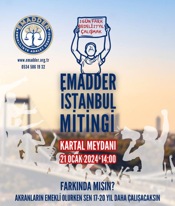 Kısa adı EMADDER olan Emeklilikte Adalet Derneği bu kapsamda yarın Büyük İstanbul Mitingi düzenleyecek.