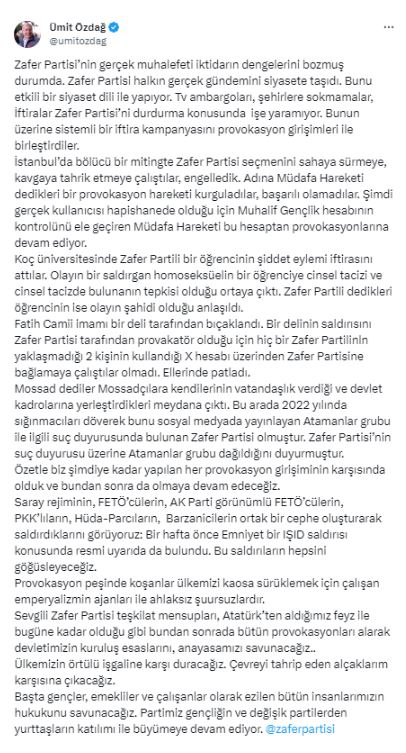 Sosyal medya hesabından konuyla ilgili açıklamada bulunan Özdağ, ‘‘Şimdiye kadar yapılan her provokasyon girişiminin karşısında olduk ve bundan sonra da olmaya devam edeceğiz. Saray rejiminin, FETÖ’cülerin, AK Parti görünümlü FETÖ’cülerin, PKK’lıların, Hüda-Parcıların, Barzanicilerin ortak bir cephe oluşturarak saldırdıklarını görüyoruz: Bir hafta önce Emniyet bir IŞID saldırısı konusunda resmi uyarıda da bulundu. Bu saldırıların hepsini göğüsleyeceğiz. Provokasyon peşinde koşanlar ülkemizi kaosa sürüklemek için çalışan emperyalizmin ajanları ile ahlaksız şuursuzlardır’’ ifadelerini kullandı.