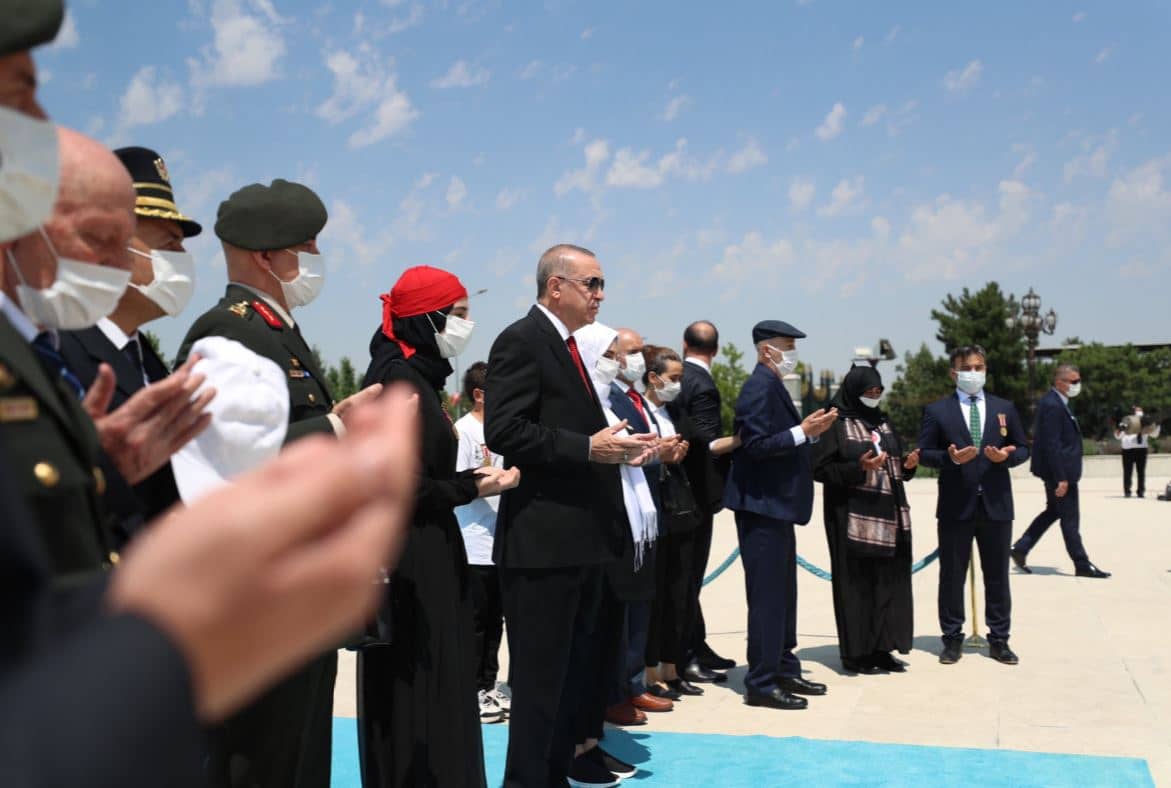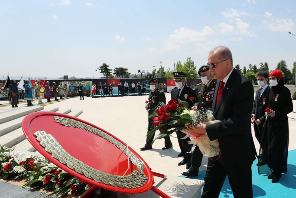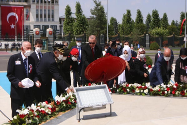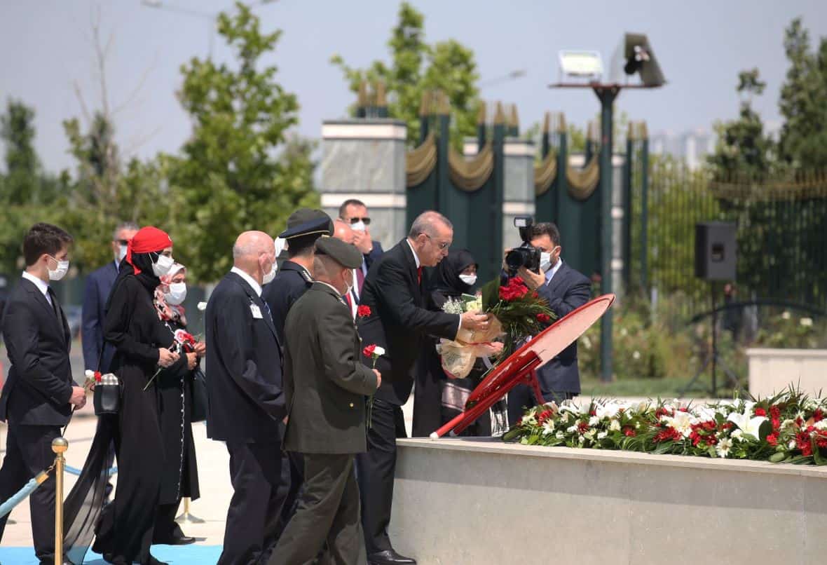 Beştepe'deki ilk törene katılan Cumhurbaşkanı Recep Tayyip Erdoğan, 15 Temmuz şehitleri anısına inşa edilen anıta çelenk bıraktı ve dua etti.