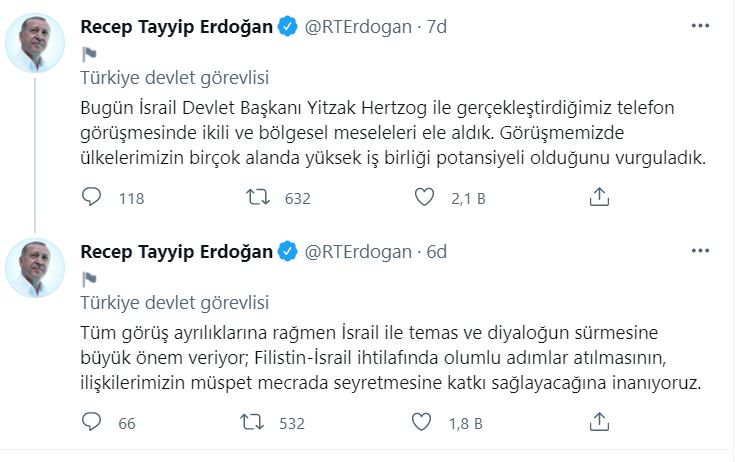 "Bugün İsrail Devlet Başkanı Yitzak Hertzog ile gerçekleştirdiğimiz telefon görüşmesinde ikili ve bölgesel meseleleri ele aldık. Görüşmemizde ülkelerimizin birçok alanda yüksek iş birliği potansiyeli olduğunu vurguladık.