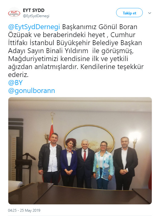 Açıklamada, "Başkanımız Gönül Boran Özüpak ve beraberindeki heyet , Cumhur İttifakı İstanbul Büyükşehir Belediye Başkan Adayı Sayın Binali Yıldırım ile görüşmüş, Mağduriyetimizi kendisine ilk ve yetkili ağızdan anlatmışlardır. Kendilerine teşekkür ederiz." denildi.