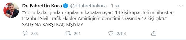 Sağlık Bakanı Fahrettin Koca haberi sosyal medya hesabından haberi paylaşarak " Salgına karşı kaç kişiyiz?" diyerek vatandaşları bu konuda uyardı. Koca: “Yolcu fazlalığından kapılarını kapatamayan, 14 kişi kapasiteli minibüsten İstanbul Sivil Trafik Ekipler Amirliğinin denetimi sırasında 42 kişi çıktı.” SALGINA KARŞI KAÇ KİŞİYİZ?" dedi.