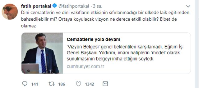Fatih Portakal, Bakan Ziya Selçuk'a gündeme dair çok konuşulacak sorular sordu. Sosyal medya hesabı üzerinden sorularını sıralayan Fatih Portakal, "Unutturulmaya çalışılan laik eğitim hakkında düşüncesi nedir?” dedi.
