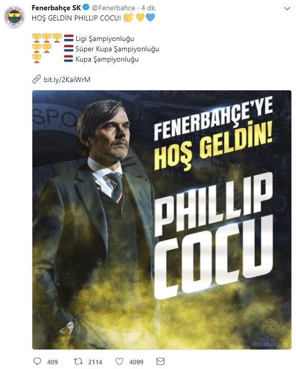Kulübümüzle 3 yıllık anlaşmaya varan Phillip Cocu, konuyla ilgili olarak yaptığı açıklamada “Kulübün yakın gelecek için hazırladığı planlardan çok etkilendiğimi söylemeliyim. Fenerbahçe harika bir kulüp, Ali Koç ve Damien Comolli’nin bana anlattığı vizyon, fikirler çok ümit verici. Böyle önemli bir kulübün parçası olmaktan gurur duyuyorum. Oyuncularla çalışmayı ve Şükrü Saracoğlu Stadı’nda taraftarlarımızın önünde takımımıza liderlik etmeyi dört gözle bekliyorum. Bu yolculuğa başlamak için sabırsızlanıyorum” dedi.